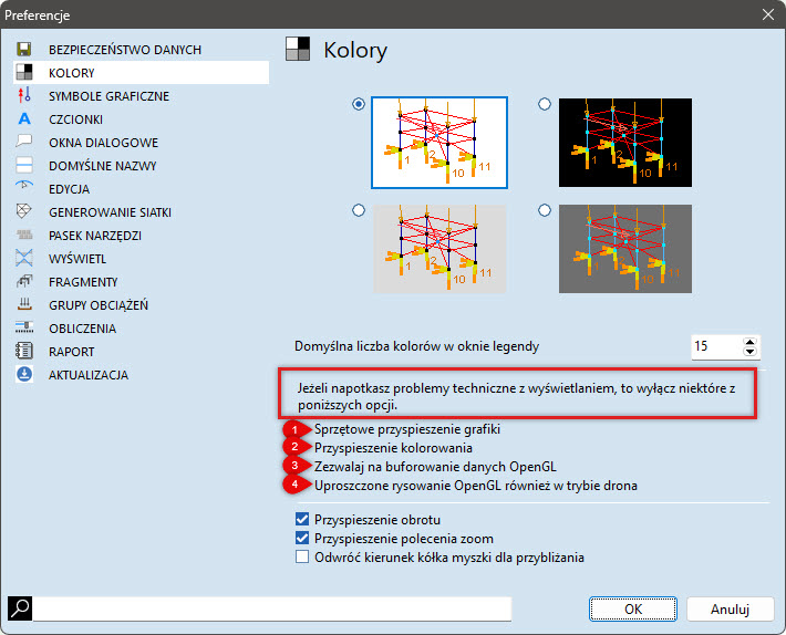 należy w programie zmienić ustawienia powiązane z kartą graficzną. Opisane spowolnienie działania może wystąpić po instalacji lub aktualizacji AxisVM, gdy wcześniejsze ustawienia zostaną zmienione.